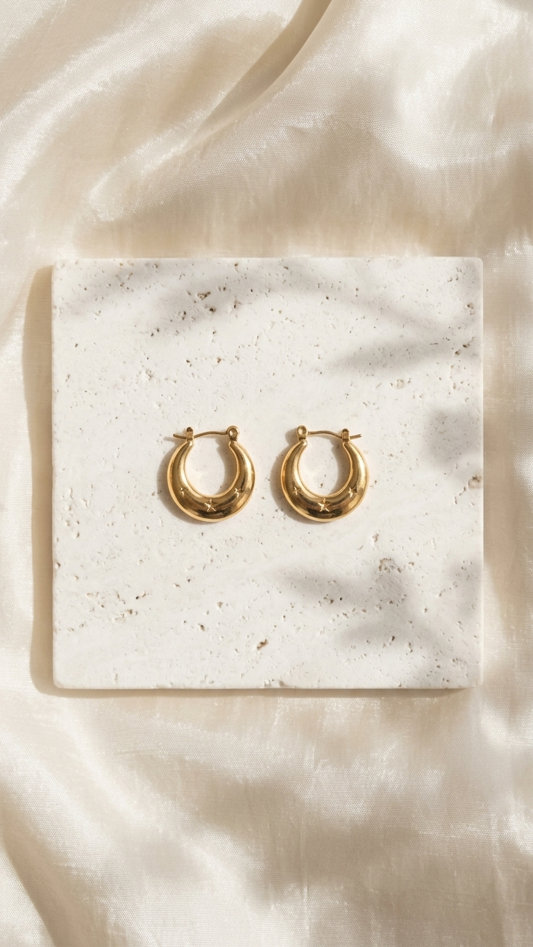 Elevate your everyday style with a touch of cosmic magic. These Stellar Crescent Huggies feature a bold, tapered dome design—reminiscent of classic vintage luxury—delicately engraved with tiny, shimmering stars.