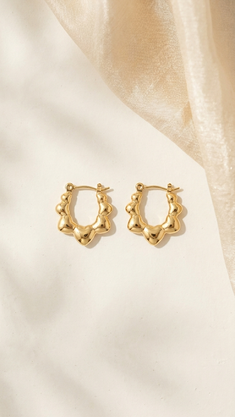Show yourself some love with these adorable Golden Heart Bloom Huggies. These mini hoops feature a unique, scalloped silhouette made of delicate interconnected golden hearts. The high-polish finish catches the light beautifully, making them a subtle yet eye-catching addition to your jewelry rotation. Designed for comfort and style, these lightweight hoops hug the earlobe perfectly. Whether you're dressing up for a date night or adding a sweet touch to your everyday look, these earrings are the perfect way to wear your heart on your... ears.