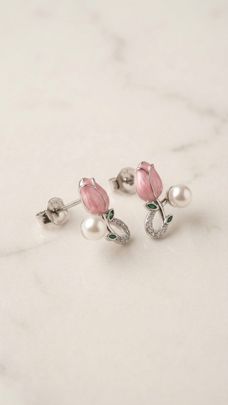 Add a touch of elegance and charm to your look with these beautifully crafted Blossom Pearl Drop Earrings. Designed with delicate pink tulip-shaped enamel detailing, accented by sparkling stones and tiny green leaf motifs, these earrings bring a graceful floral vibe. The lustrous pearl drop enhances their sophistication, making them perfect for both everyday wear and special occasions. Lightweight and stylish, these earrings are ideal for women who love subtle yet eye-catching jewelry. Pair them with ethnic outfits or modern dresses to elevate your overall look effortlessly.
