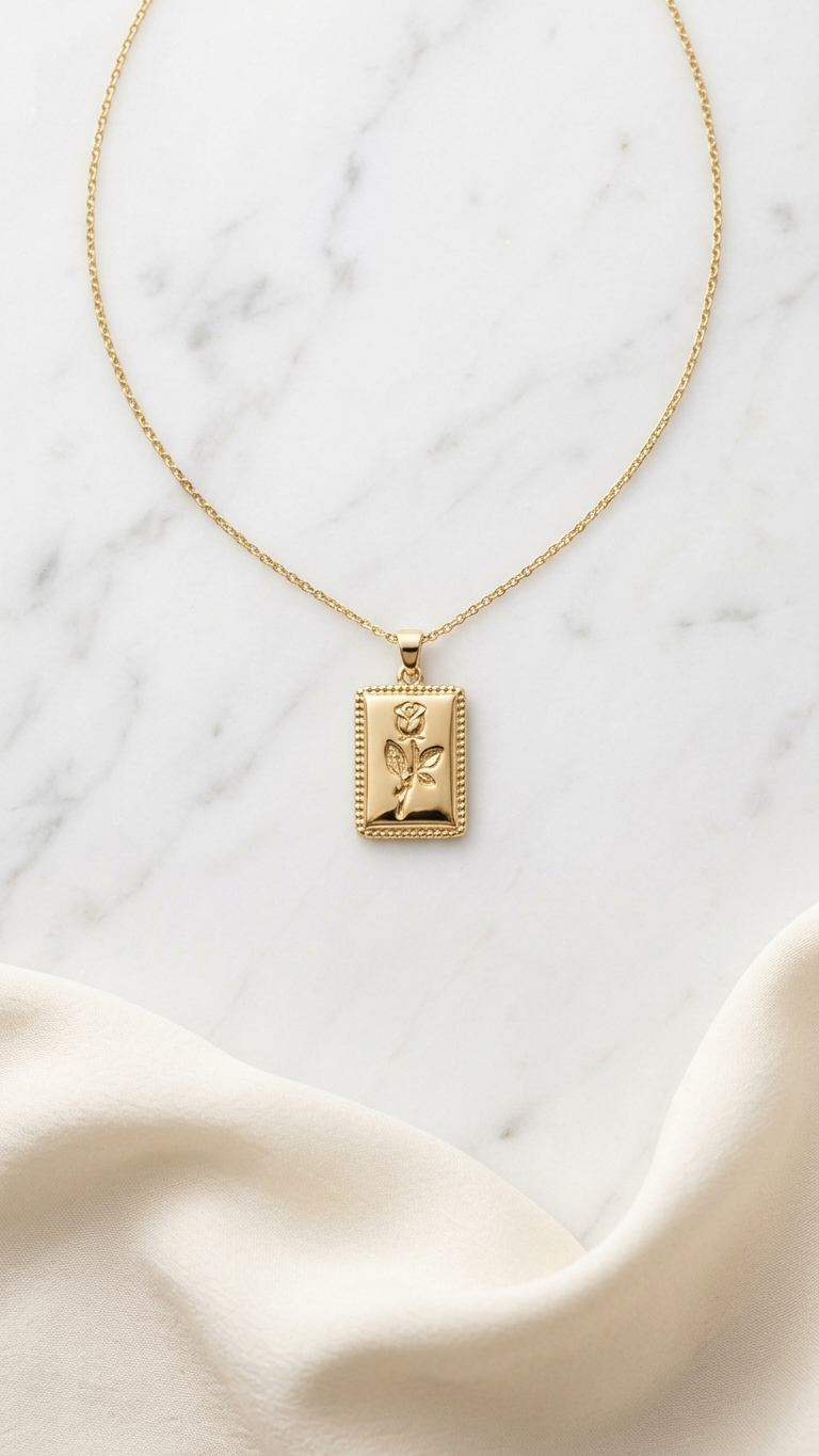 Timeless elegance meets modern craftsmanship in the Golden Bloom Medallion Necklace. This piece features a finely detailed rectangular pendant embossed with a delicate rose motif, set within a classic beaded border. Suspended from a sleek, high-polish snake chain, the pendant rests perfectly to add a touch of sophisticated charm to any neckline. Whether worn as a standalone statement or layered with daintier gold chains, this necklace is designed to be a versatile staple in your collection. Its vintage aesthetic makes it a thoughtful gift or a beautiful personal talisman.